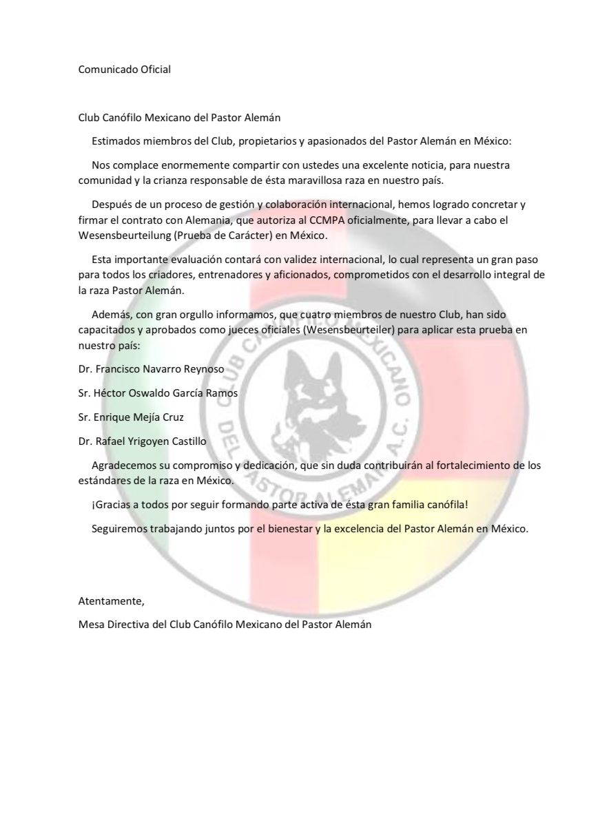 Es un honor para nosotros dirigirnos a ustedes en esta nueva etapa de nuestro Club Canófilo Mexicano del Pastor Alemán “CCMPA “. La reciente elección de nuestra mesa directiva (2025-2028) representa no solo un cambio en la gestión, sino también una gran oportunidad para fortalecer los lazos entre todos los miembros de nuestra comunidad y trabajar juntos por el bienestar de nuestra amada raza